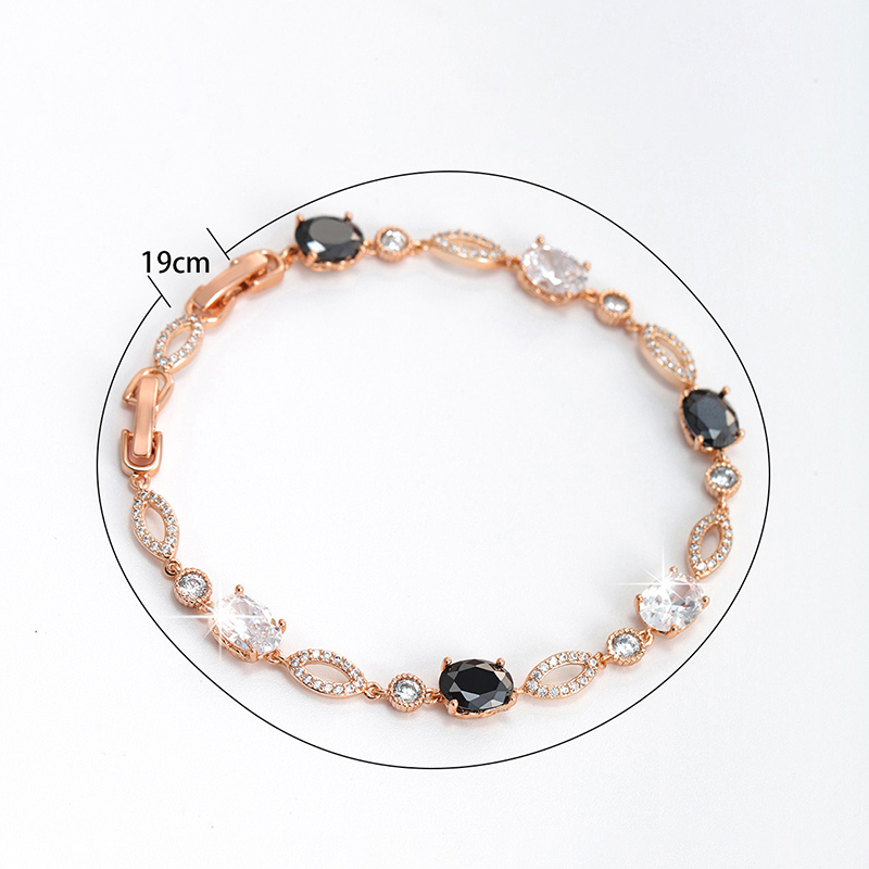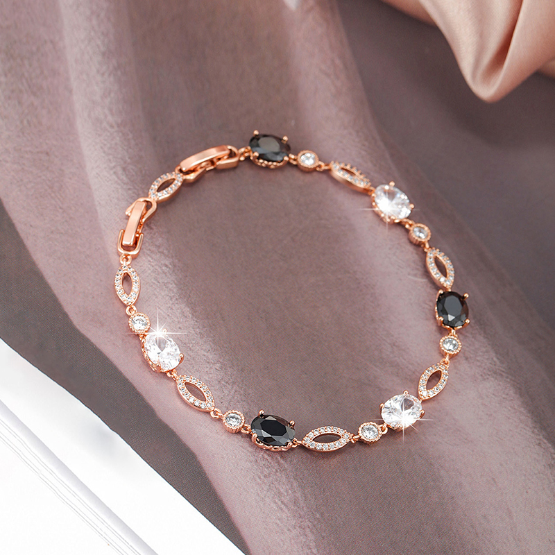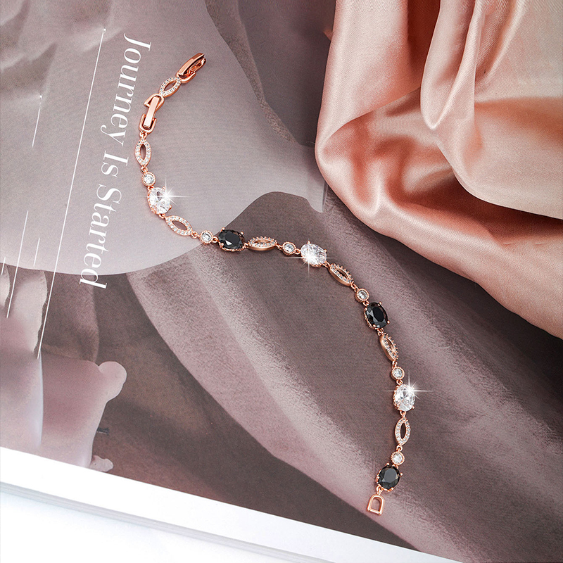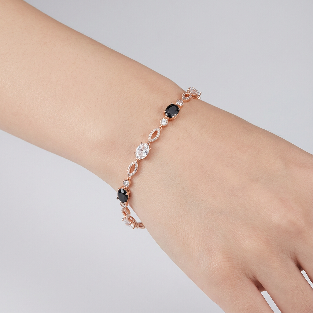Monochrome Contrast The interplay between jet-black oval crystals and bright clear stones creates a bold, graphic effect inspired by classic Art Deco styling— confident, polished, and endlessly wearable. Soft Rose Gold Tone Finished in a gentle rose gold tone, the warm blush hue adds softness and balance, beautifully offsetting the depth and intensity of the black crystals. Fluid Movement The articulated link construction allows the bracelet to drape smoothly across the wrist, offering a flexible, comfortable feel designed for all-day wear.