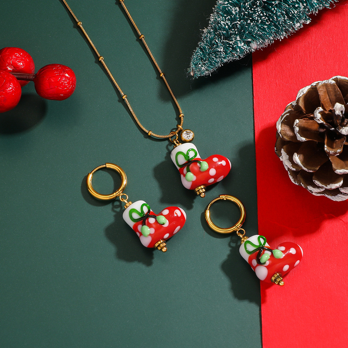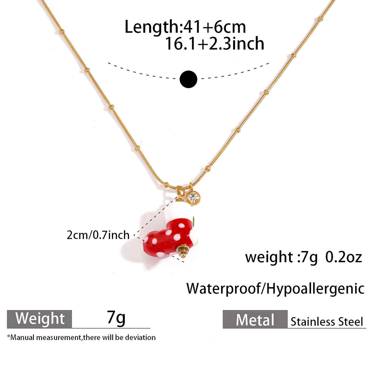Add a cozy Christmas touch to your holiday style with our Christmas Sock Necklace, featuring a charming red and white stocking charm suspended from a delicate snake chain. Crafted from premium 316 stainless steel, this necklace showcases a detailed Christmas sock pendant that captures the festive tradition of holiday stockings. Weighing just 7g, it offers lightweight comfort for all-day wear, while the adjustable 41cm+6cm chain ensures a perfect fit for any neckline.The necklace features a classic red and white color scheme that embodies the cheerful spirit of the season. The sleek snake chain provides a subtle shine that complements the playful sock charm, creating a perfect balance between festive fun and everyday elegance. Whether worn alone as a subtle holiday accent or layered with other necklaces, this piece adds a touch of Christmas warmth to any outfit.Perfect for Christmas gatherings, festive parties, or as a thoughtful gift for loved ones, this necklace brings the cozy tradition of Christmas stockings to your jewelry collection. The high-quality 316 stainless steel construction ensures lasting durability and a hypoallergenic wearing experience, making it a piece you can enjoy for many holiday seasons to come.