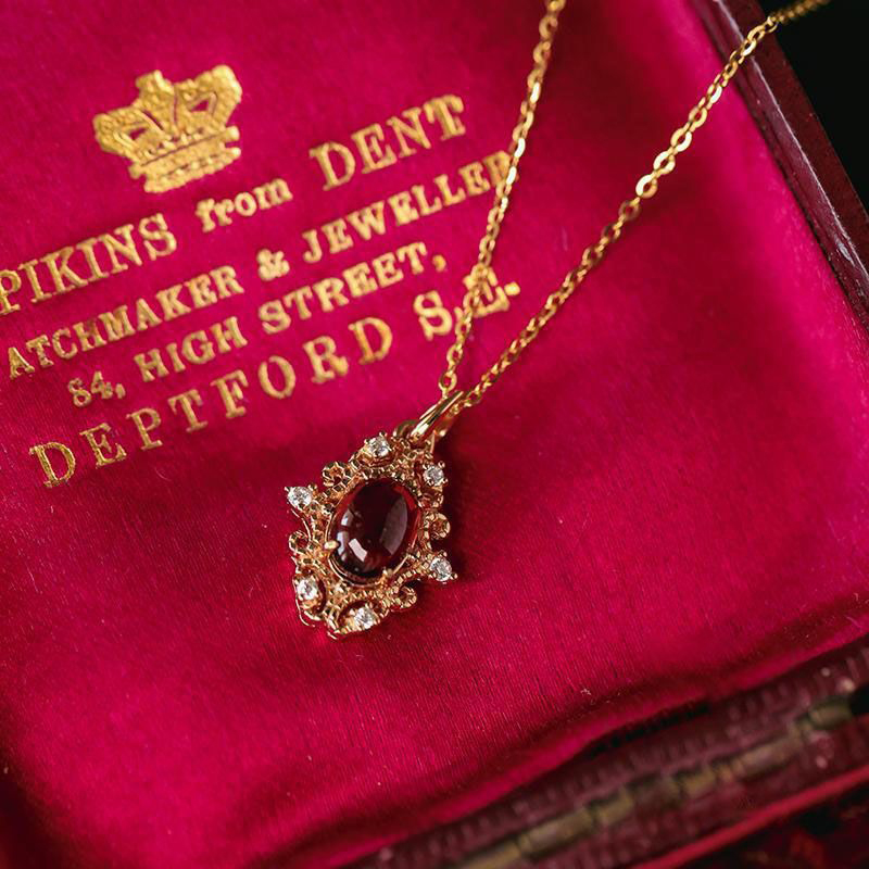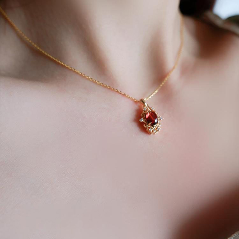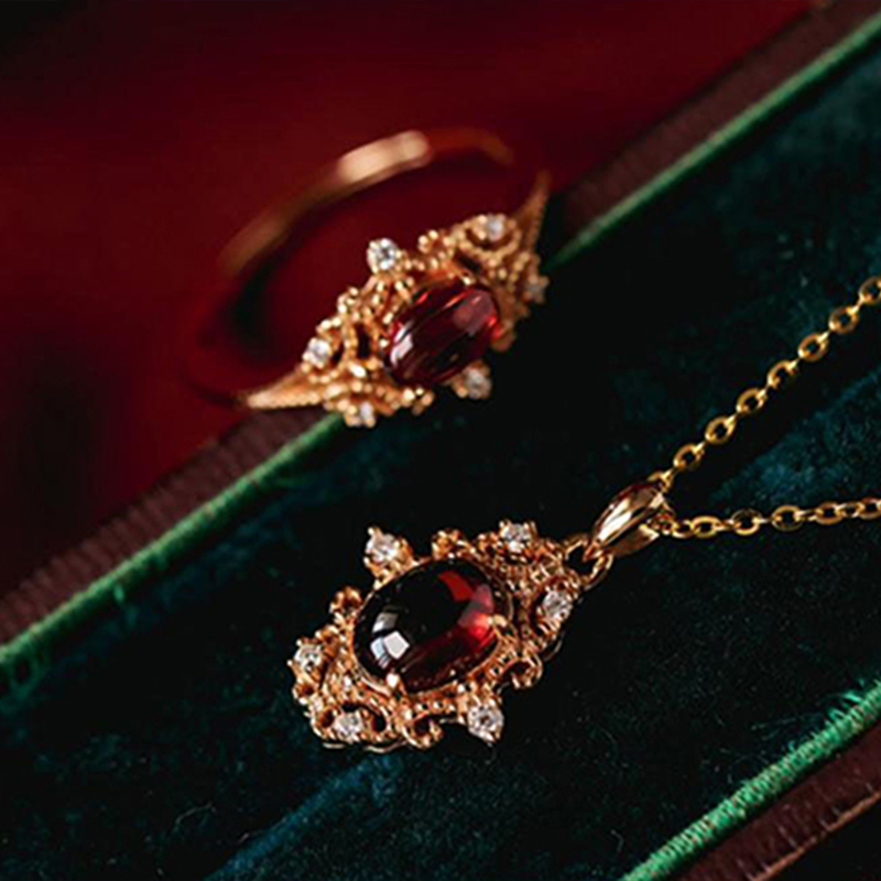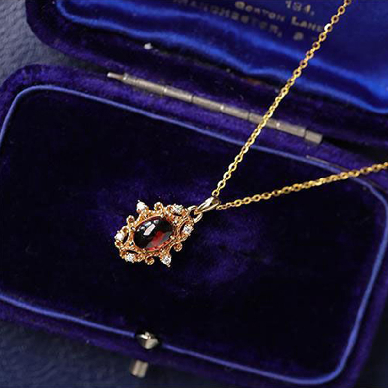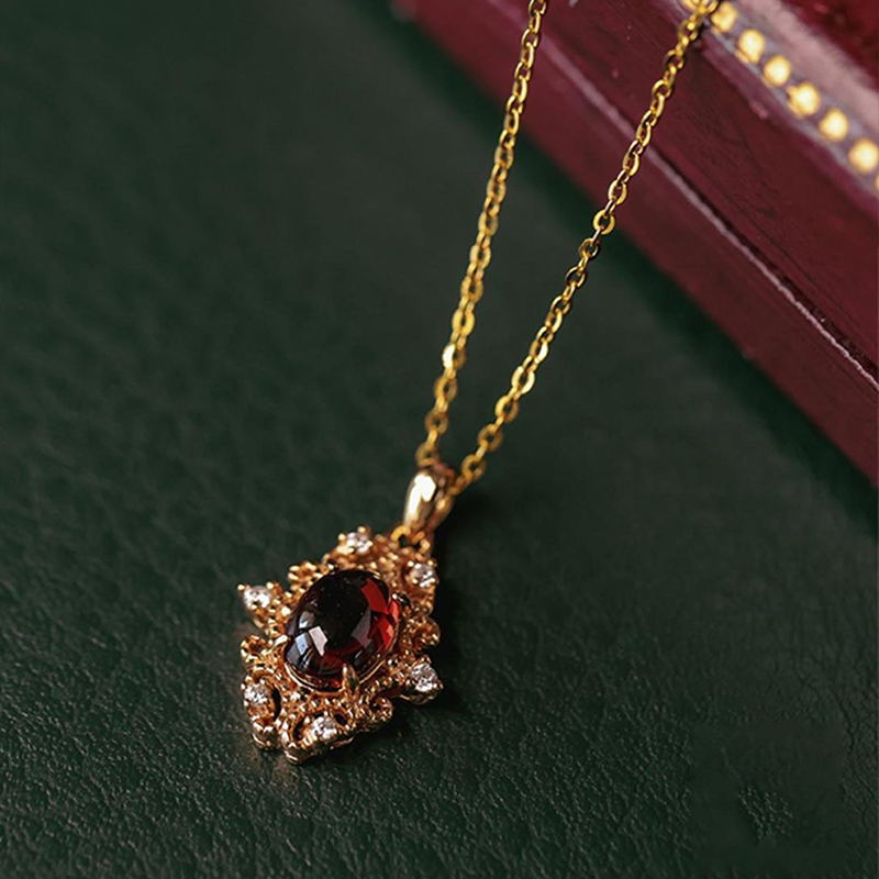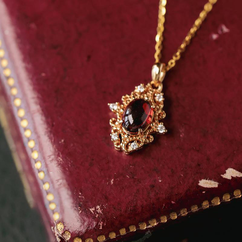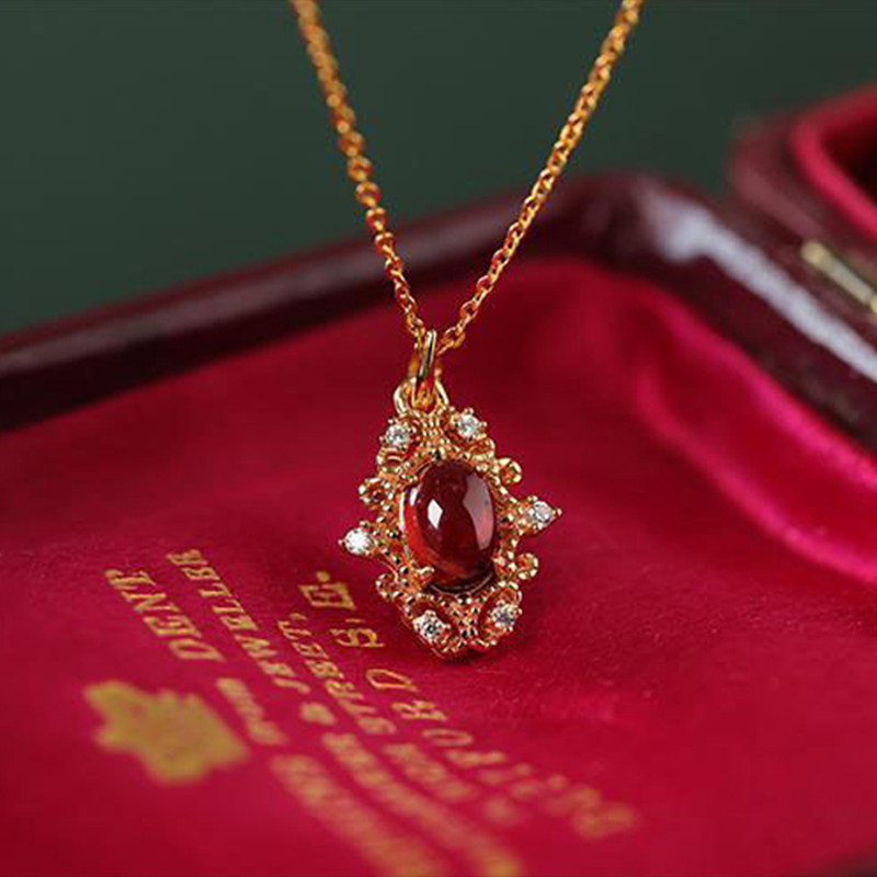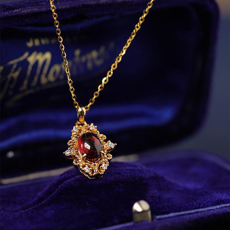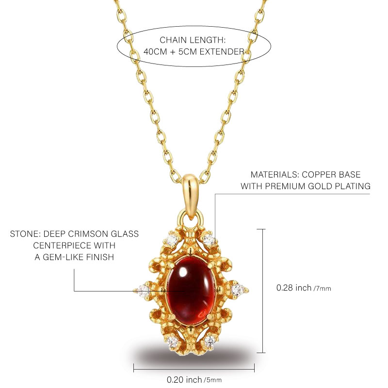 A vintage-inspired necklace featuring a deep red glass stone and ornate copper detailing. The rich crimson hue adds a touch of drama, while the antique finish gives it timeless charm. Lightweight and skin-friendly—perfect for layering or wearing alone on special evenings.