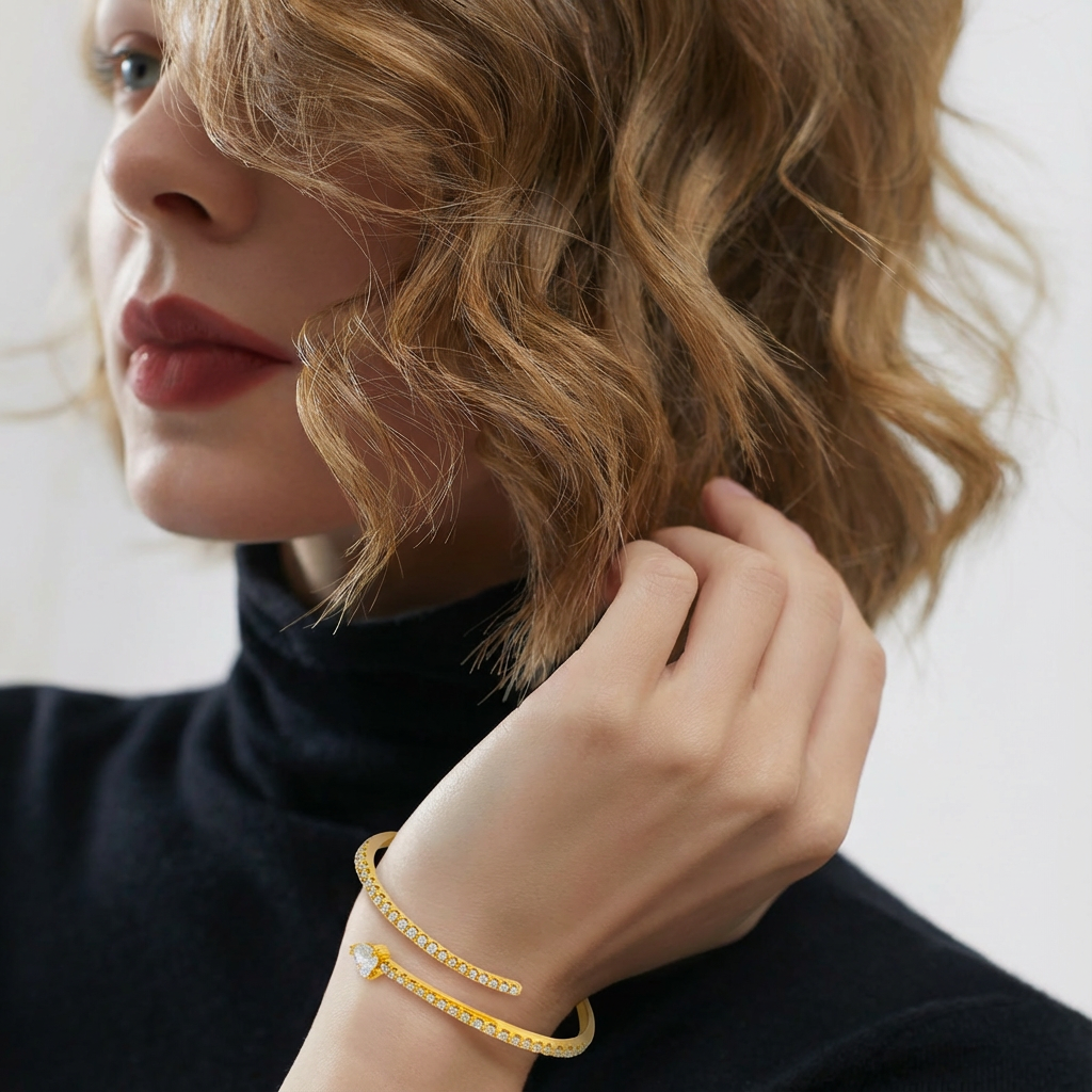 Sculptural Silhouette The wrap-style design creates a fluid, floating effect, giving the impression of a continuous golden ribbon accented with softly shimmering crystals. Striking yet refined, it is designed to be worn beautifully on its own. Rich Gold-Tone Glow Finished in a deep, 24K-inspired gold tone, the bangle carries a warm, luminous glow that contrasts elegantly with the cool sparkle of the crystals. Secure & Easy Wear Designed with a discreet hinged mechanism, the bangle opens smoothly for easy wear and closes securely for all-day comfort and confidence.THE SPECS