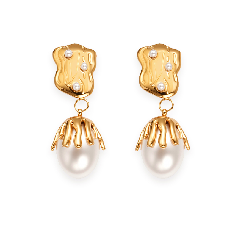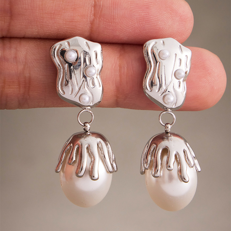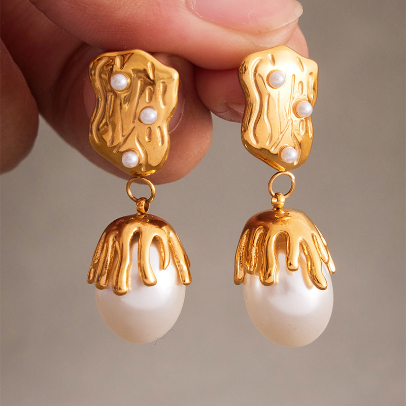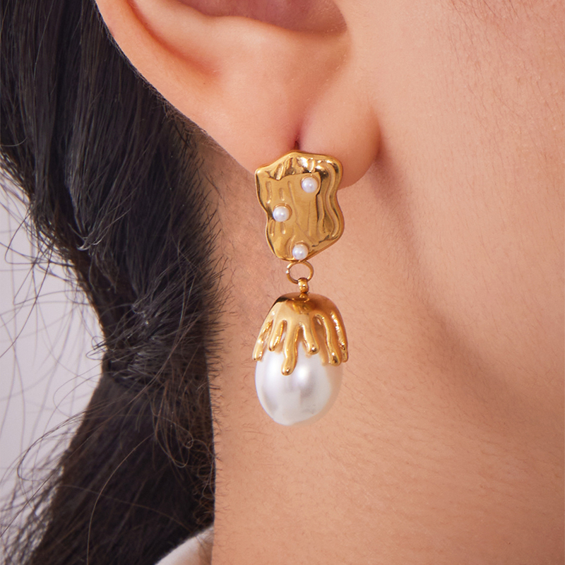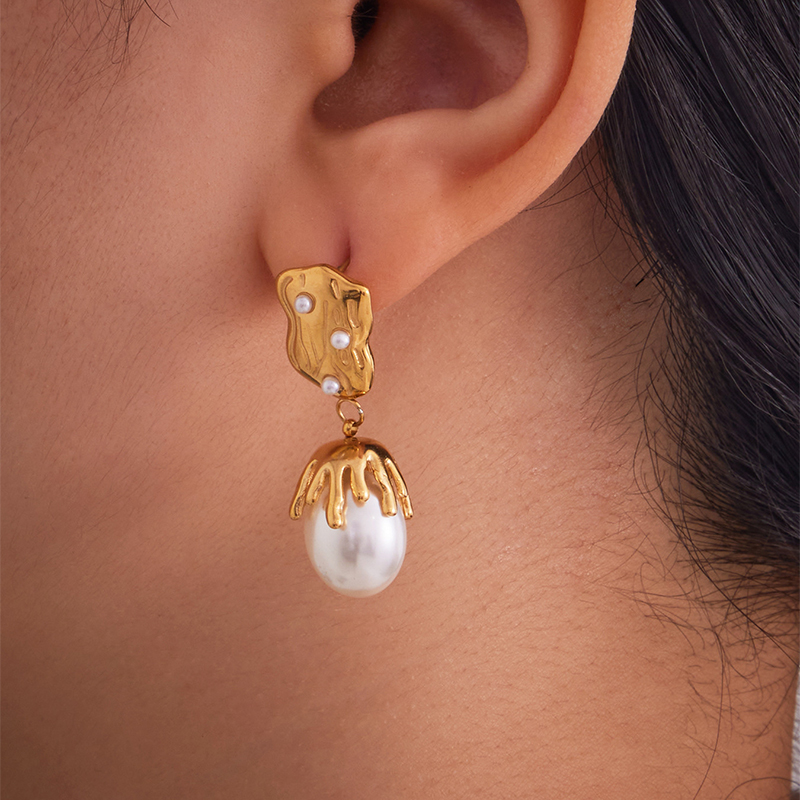 Elevate your style with our Dripping Gold Leaf Pearl Drop Earrings, where artistic design meets everyday elegance. Crafted from hypoallergenic 304 stainless steel, these earrings feature a unique melting leaf design that appears to cascade into three delicate pearls, culminating in a graceful drop pearl at the bottom. The combination of textured metal and luminous pearls creates a captivating visual contrast that catches light beautifully.Available in both warm gold and cool silver finishes, these earrings offer versatile styling options to complement any outfit. The gold version radiates luxurious warmth, while the silver option provides modern sophistication. Each piece is meticulously crafted to ensure durability and lasting shine, making them suitable for daily wear without tarnishing or causing skin irritation.Perfect for fashion-forward individuals who appreciate attention to detail, these earrings transition seamlessly from daytime casual to evening elegance. The lightweight construction (9.5g/pair) ensures comfortable all-day wear, while the secure backing keeps them firmly in place. ✨ An ideal choice for adding a touch of refined artistry to your jewelry collection or as a thoughtful gift for loved ones who appreciate unique, stylish accessories.
