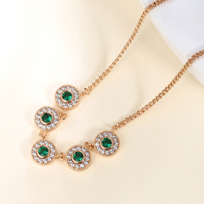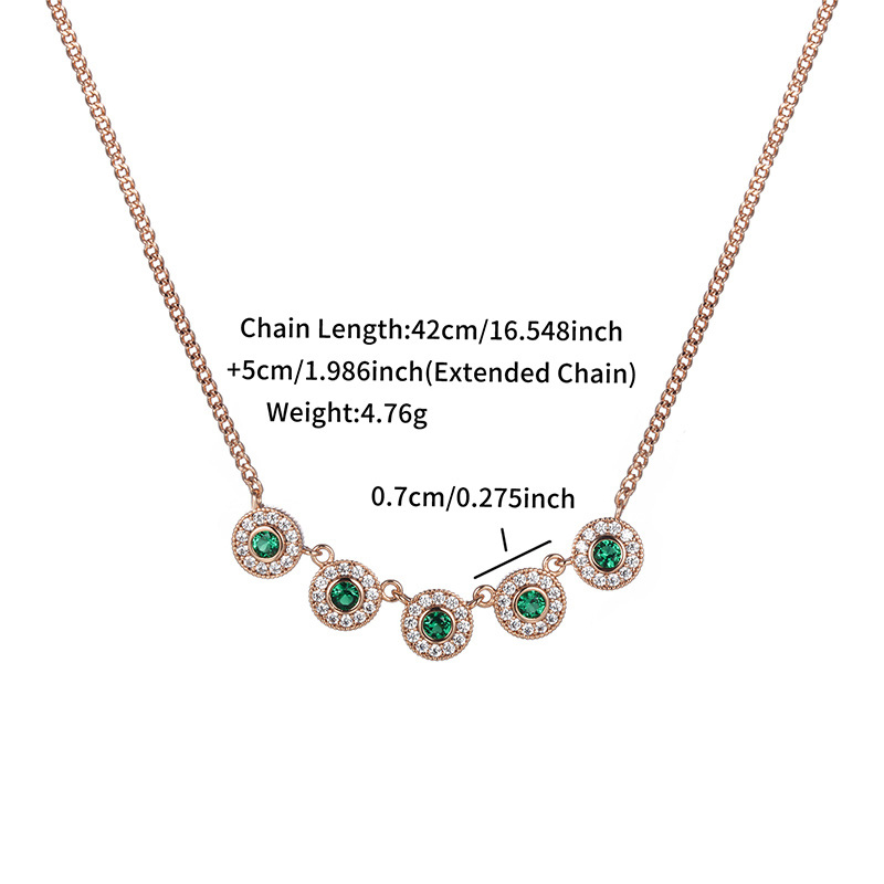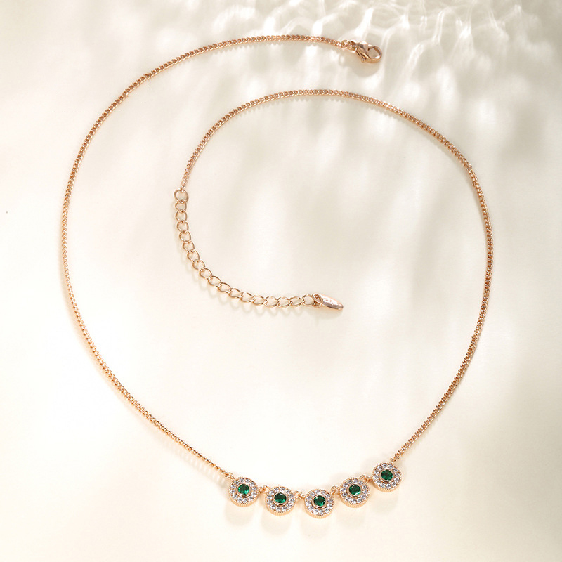 Refined detail, made for everyday wear. The Emerald Green Halo Disc Necklace adds a subtle touch of colour through a series of petite halo-set discs, each centred with a rich emerald-green crystal for a soft, rhythmic sparkle along the neckline. Crafted from gold-tone copper alloy, this delicate collarbone-length necklace is designed for everyday wear, offering lightweight comfort and an easy, polished finish.