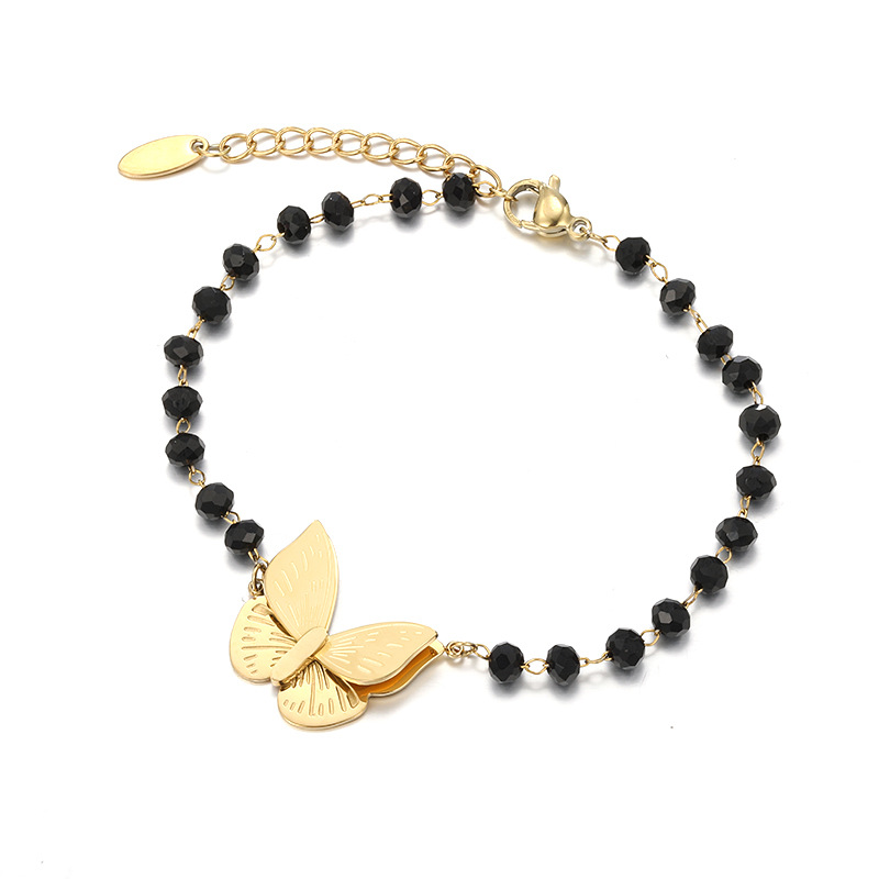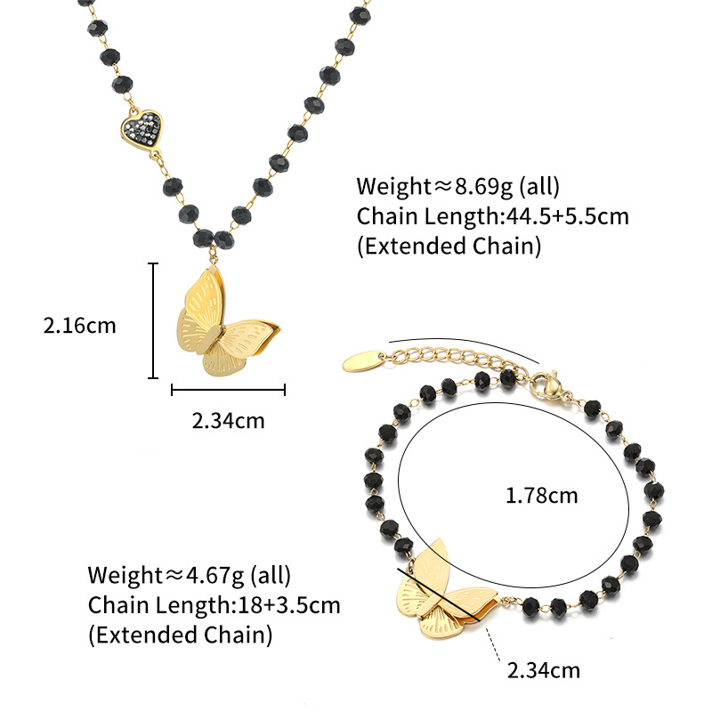 Everyday Durability Made from stainless steel with a warm gold-tone finish, this set is designed for regular wear, offering long-lasting shine and resistance to everyday tarnishing. Classic Contrast Faceted black beads paired with gold-tone accents create a timeless, rosary-style rhythm that adds depth, texture, and a refined sense of contrast to the overall design. Thoughtful Details The necklace is finished with a subtle asymmetrical black crystal heart charm, adding a gentle touch of sparkle and personality without overwhelming the look.THE SPECS