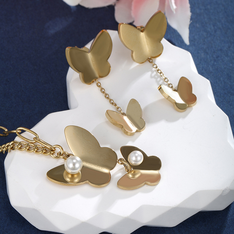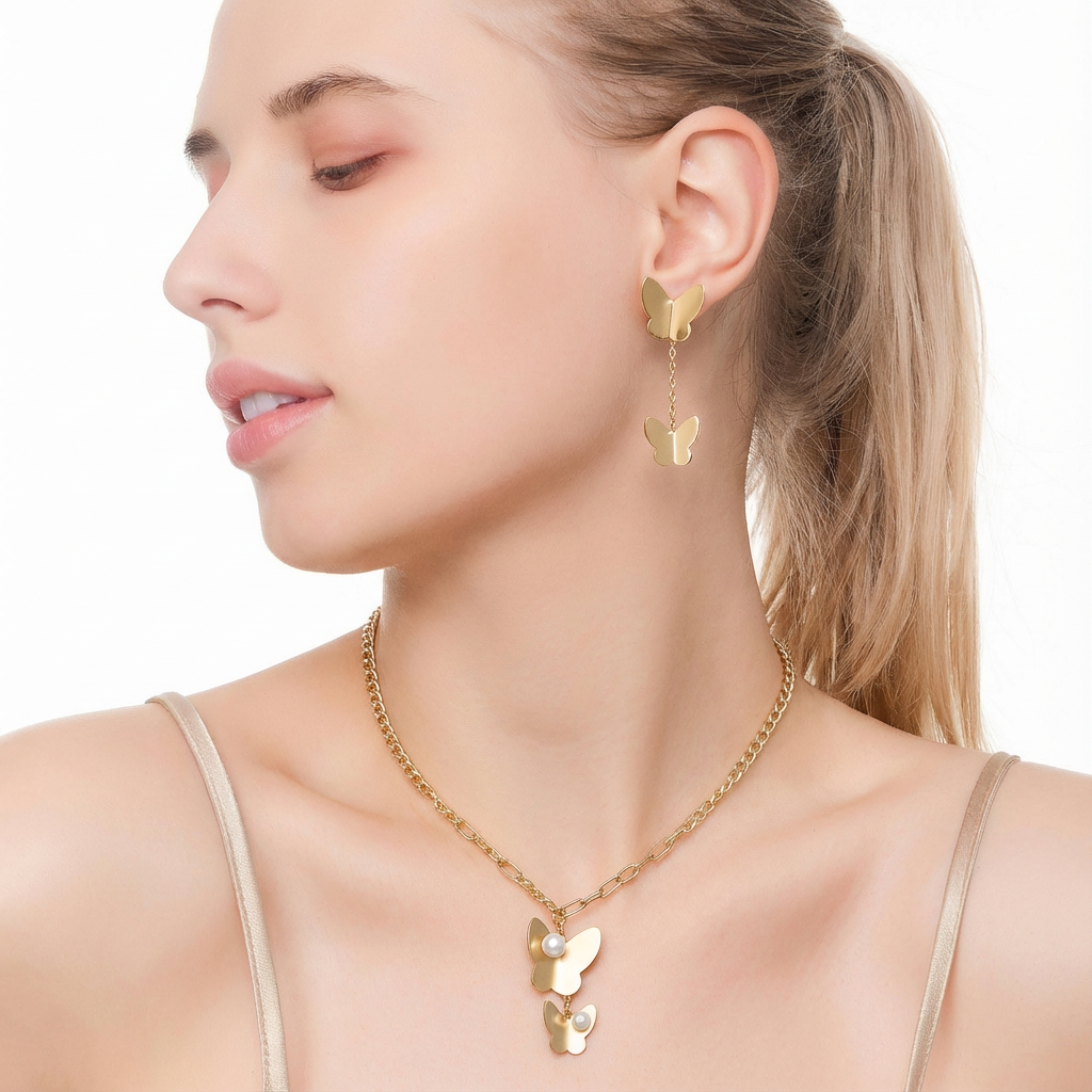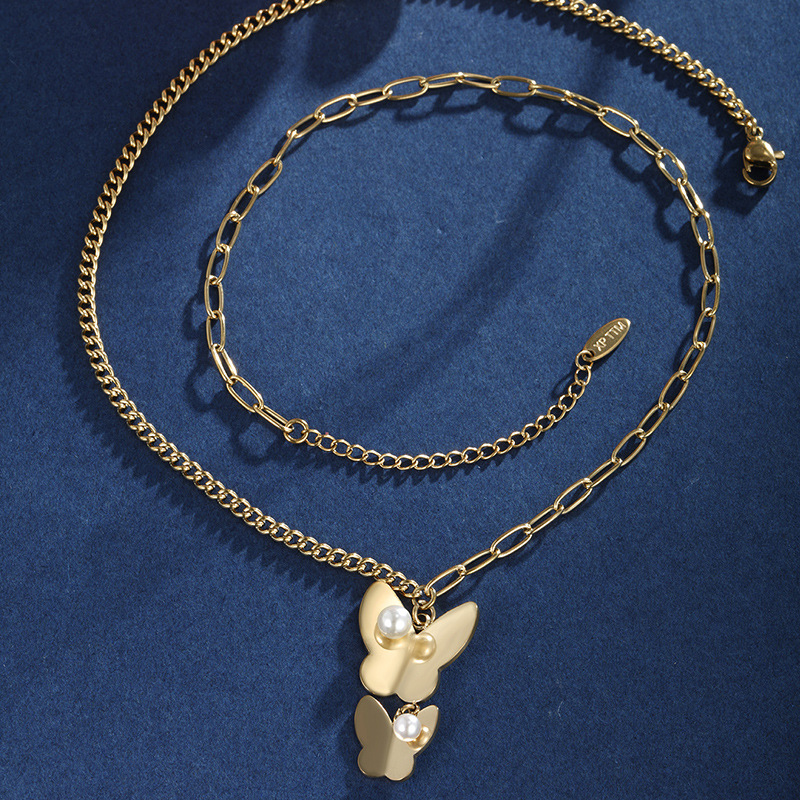 Trend-Led Asymmetry The necklace features a distinctive mixed-link chain—combining curb and paperclip links— to create a modern, fashion-forward contrast that elevates the romantic butterfly motif. Soft, Matte Finish Finished in a chic matte gold tone, the butterfly details offer a more understated alternative to high-shine gold, pairing beautifully with the gentle lustre of faux pearl accents. Designed with Care The chain is crafted from stainless steel for everyday durability and comfort, while the butterfly details are carefully formed in gold-tone alloy to highlight fine, sculptural detailing.THE SPECS