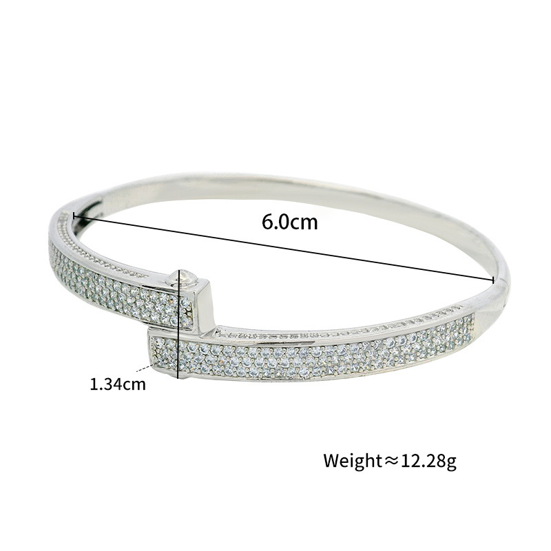 Geometric Elegance Breaking away from traditional round bangles, the clean lines of the pavé-set rectangular bars introduce a sharp, modern character while remaining refined and effortlessly wearable. Seamless Fit Designed with a discreet hinged mechanism and secure clasp, the bangle opens smoothly for easy wear and closes confidently in place— no forcing or squeezing required. Cool Silver-Tone Finish The polished silver-tone surface delivers a bright, mirror-like shine that pairs effortlessly with minimalist jewellery or more statement-led pieces.THE SPECS