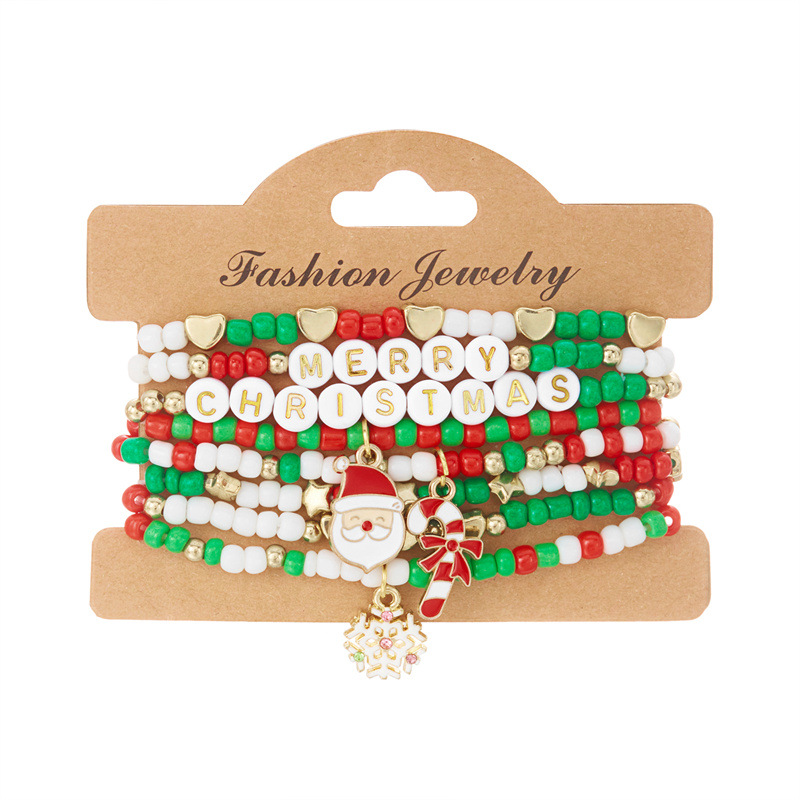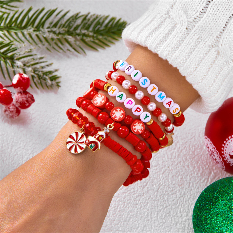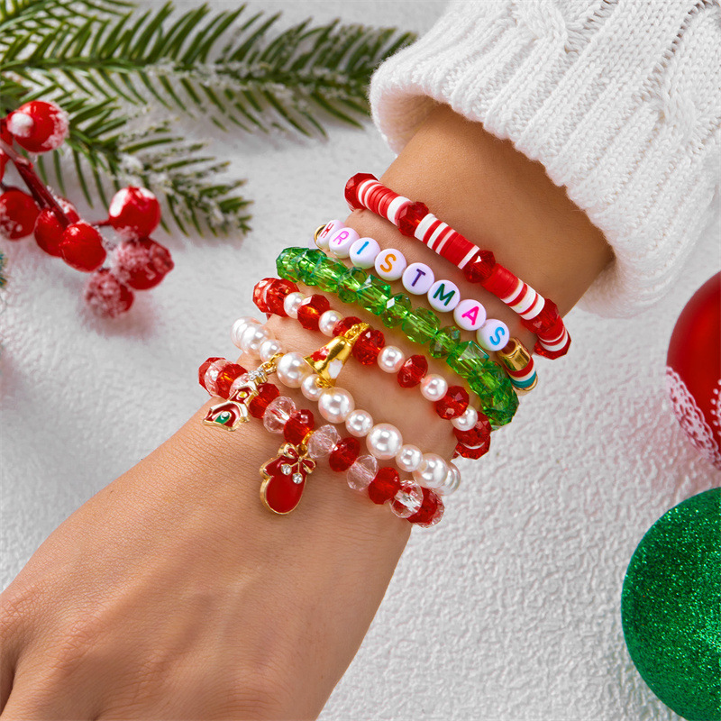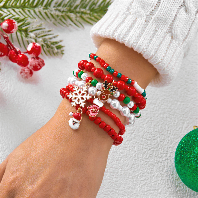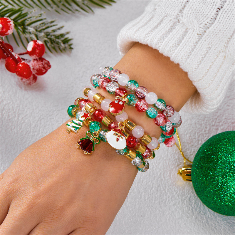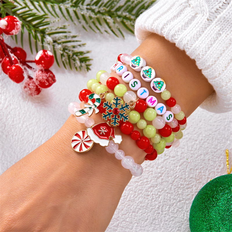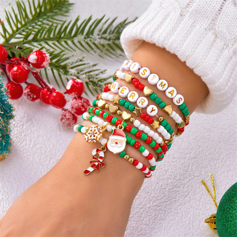 Create your perfect holiday look with our Stackable Christmas Bracelet Set, designed for effortless festive styling. This carefully curated collection features a variety of Christmas-themed bracelets combining zinc alloy charms and frosted glass beads on flexible elastic cords. Each piece showcases unique holiday motifs – from classic Santa silhouettes to delicate snowflakes – allowing you to mix and match for a personalized layered effect.The adjustable elastic design ensures a comfortable fit for most wrists while enabling easy stacking without bulk. Perfect for Christmas parties, holiday gatherings, or as a thoughtful gift, these bracelets can be worn together for a bold statement or separately for subtle festive accents. The durable zinc alloy construction maintains its shine throughout the season, while the frosted glass beads catch the light with a soft, wintery glow.Ideal for Christmas markets, secret Santa exchanges, or adding festive cheer to your everyday style. Each set brings the magic of Christmas to your wrist with timeless designs that celebrate the joy of the season.