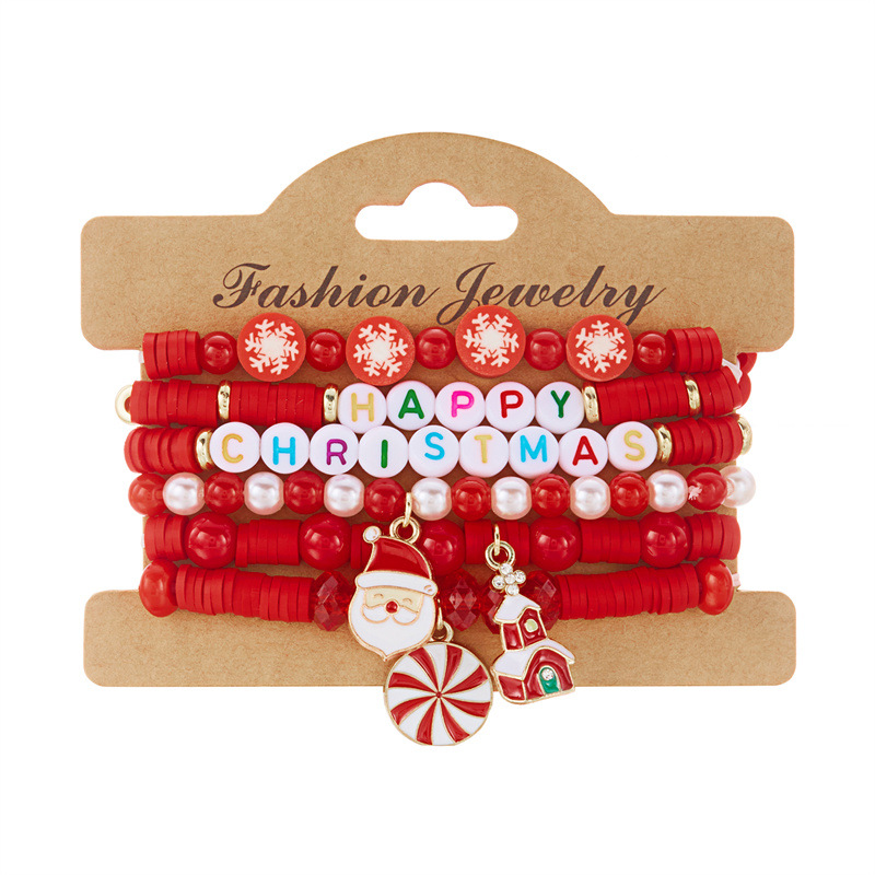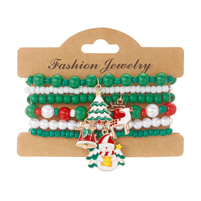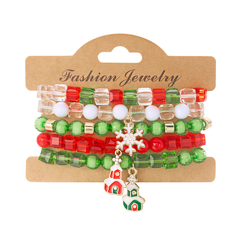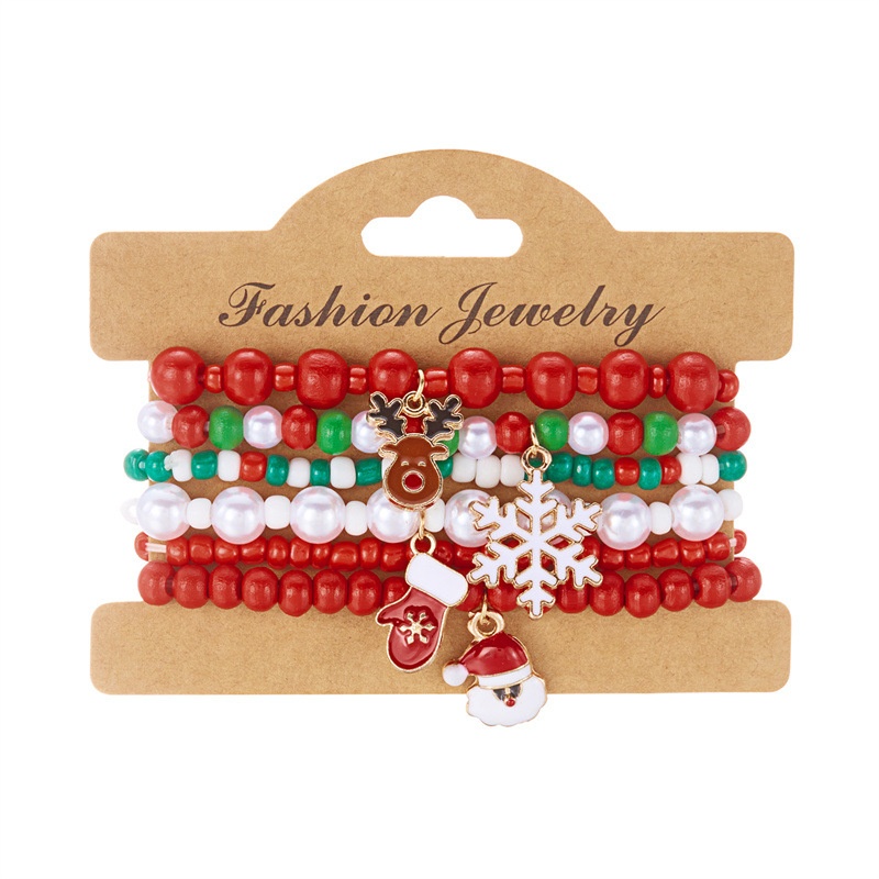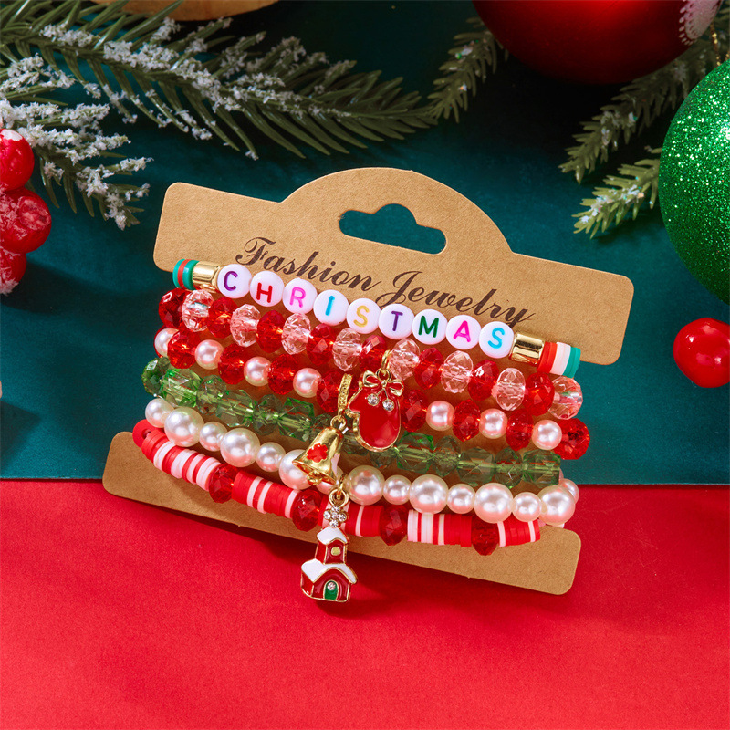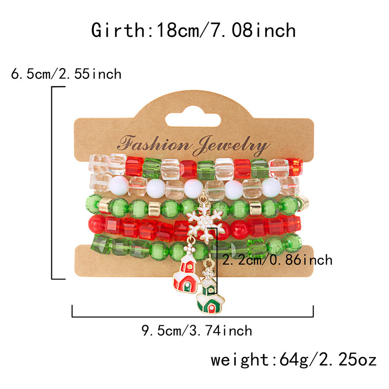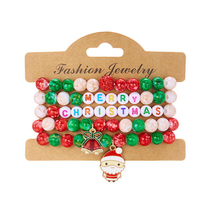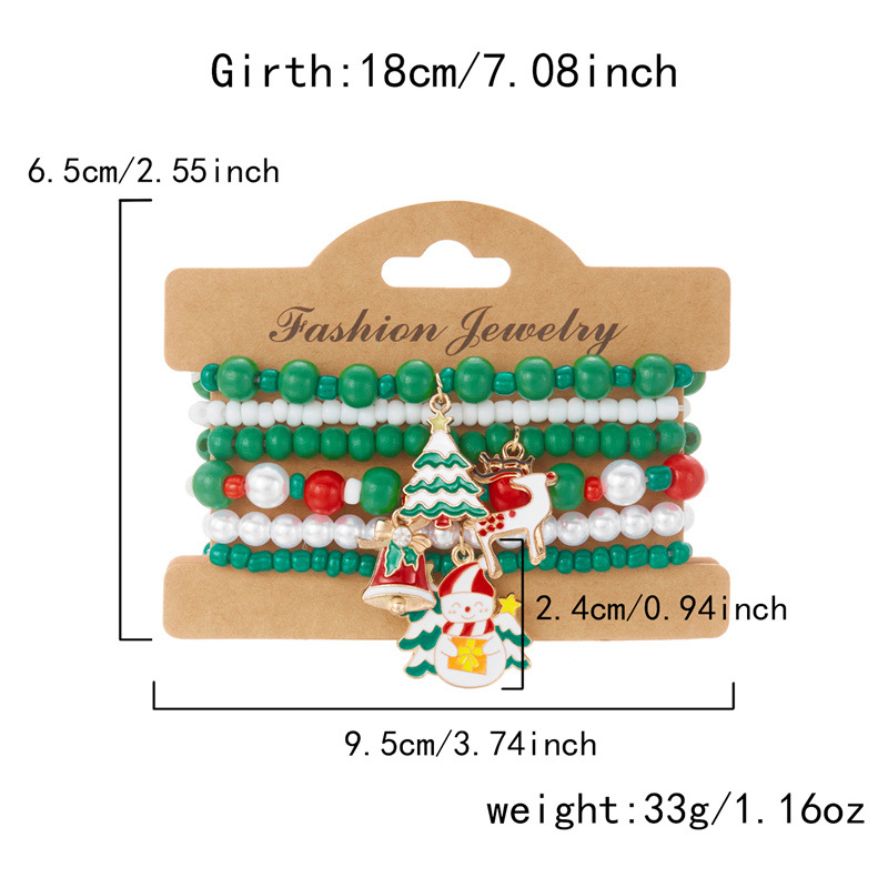 Create your perfect holiday look with our Stackable Christmas Bracelet Set, designed for effortless festive styling. This carefully curated collection features a variety of Christmas-themed bracelets combining zinc alloy charms and frosted glass beads on flexible elastic cords. Each piece showcases unique holiday motifs – from classic Santa silhouettes to delicate snowflakes – allowing you to mix and match for a personalized layered effect.The adjustable elastic design ensures a comfortable fit for most wrists while enabling easy stacking without bulk. Perfect for Christmas parties, holiday gatherings, or as a thoughtful gift, these bracelets can be worn together for a bold statement or separately for subtle festive accents. The durable zinc alloy construction maintains its shine throughout the season, while the frosted glass beads catch the light with a soft, wintery glow.Ideal for Christmas markets, secret Santa exchanges, or adding festive cheer to your everyday style. Each set brings the magic of Christmas to your wrist with timeless designs that celebrate the joy of the season.