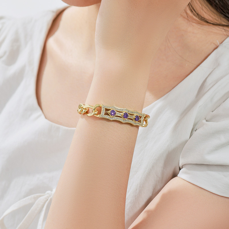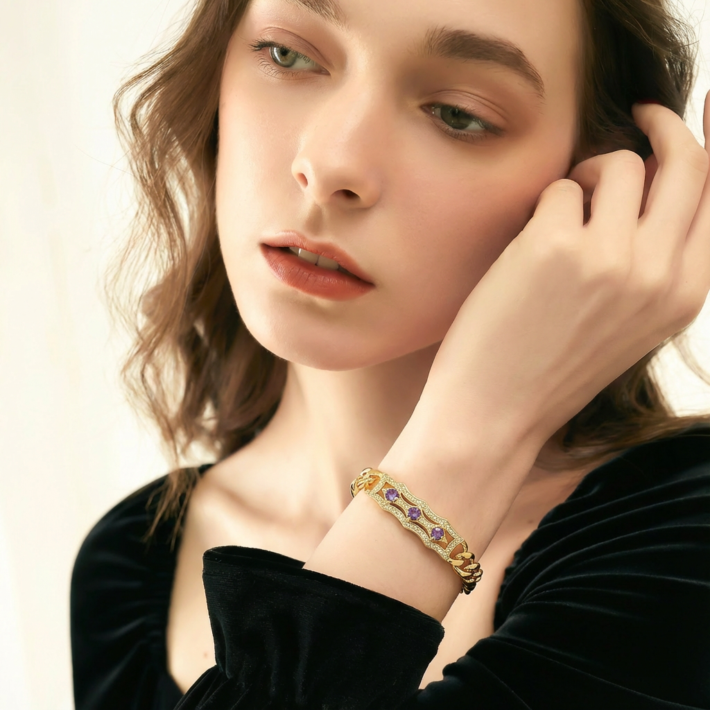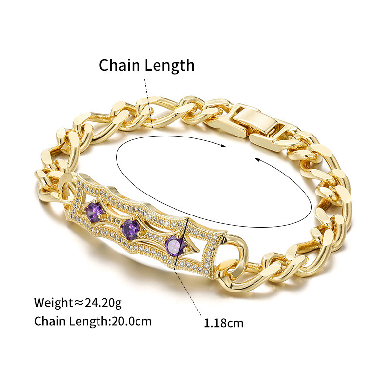 Classic Cuban Chain Featuring flat, polished Cuban links, the chain sits smoothly against the wrist, delivering a strong, substantial presence with a refined finish. Decorative Centrepiece At the centre, a sculpted bar is set with three amethyst-coloured crystals and framed by subtle pavé accents, adding vintage-inspired detail without appearing ornate. Confident Weight With a reassuring, solid feel, this bracelet is designed to make an impact while remaining comfortable for extended wear.THE SPECS