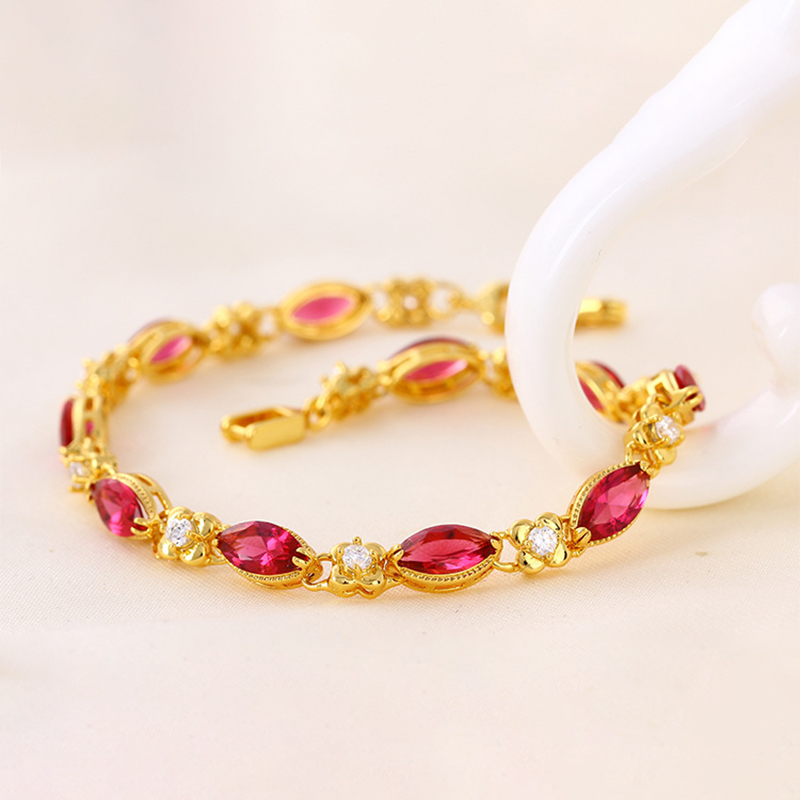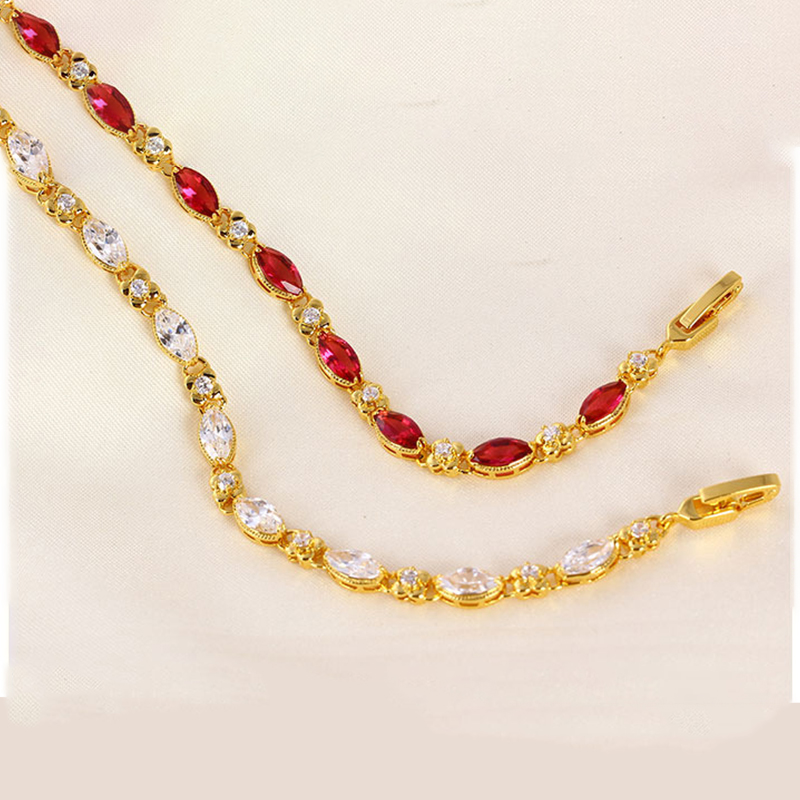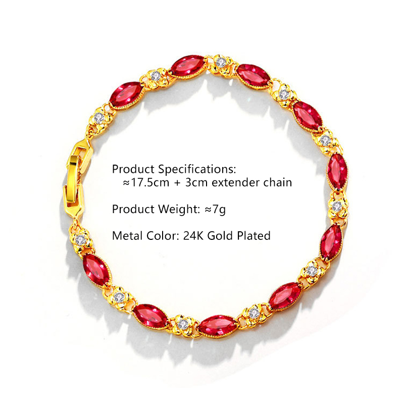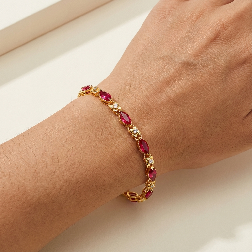 Regal Aesthetics Marquise-cut stones are arranged in a classic link formation, creating a slender, graceful line that recalls the elegance of traditional ruby-inspired jewellery designs. Rich Gold-Tone Finish Finished in a deep, 24K-inspired gold tone, the bracelet carries a warm, saturated glow that enhances the intensity of the red stones— classic in character, never costume-like. Comfortable, Adjustable Fit Designed with a 17.5 cm chain and a 3 cm extension, the bracelet offers a flexible, comfortable fit across a range of wrist sizes.THE SPECS